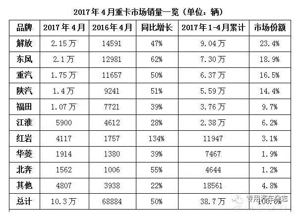 點擊量:16474月重卡同比增5成 5月會是拐點嗎?還記得在2016年底,不少業(yè)內(nèi)人士分析2017年重卡銷量走勢時指出,2017年重卡的火爆形勢會終結(jié)在一季度,從4月份開始下滑。事實情況如何呢?據(jù)相關(guān)機構(gòu)統(tǒng)計的數(shù)據(jù),今年4月,國內(nèi)重卡市場銷售各類車輛共計約10.3萬輛,比去年同期的6.89萬輛大幅增長50%,環(huán)比下降10%。4月銷量同比增長50% 解...